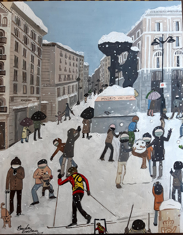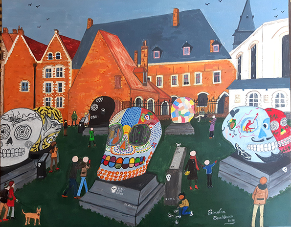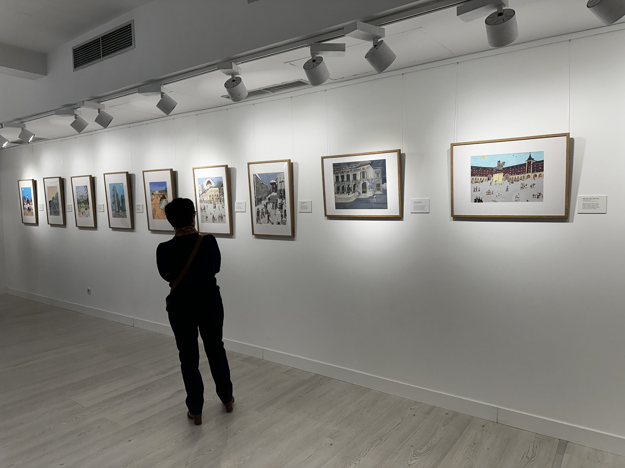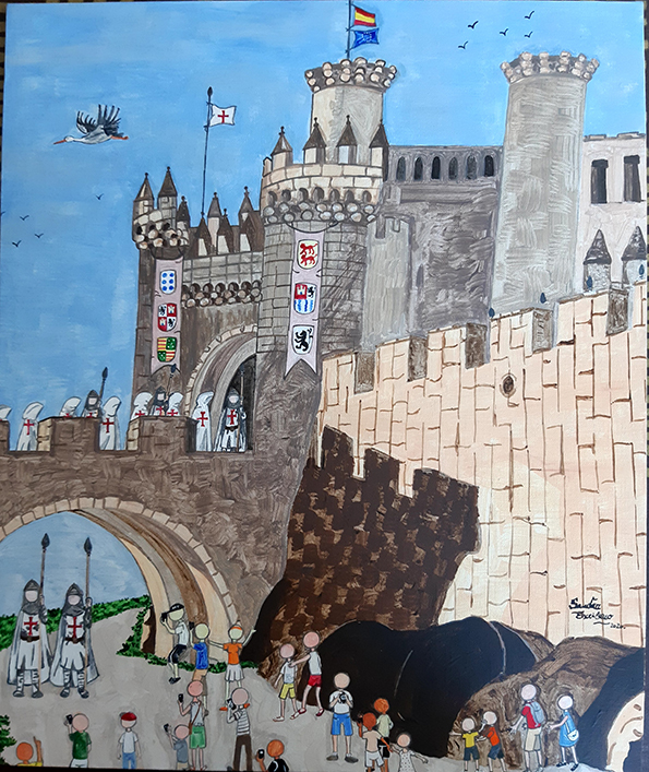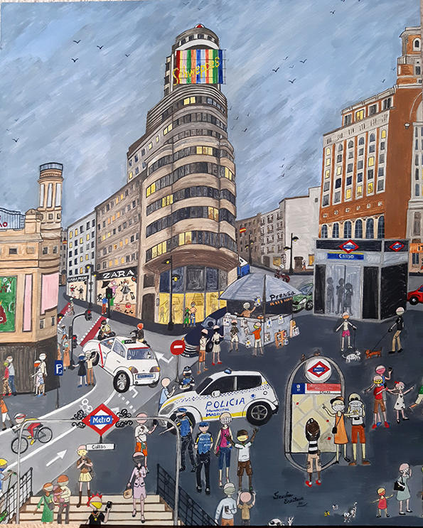 Bajo la estética colorista y aparentemente ingenua del arte Naïf, Sandra Escribano retrata la vida cotidiana a los pies de grandes monumentos, plazas y paisajes urbanos, devolviéndoles humanidad, juego y emoción. Sus personajes, pequeños pero esenciales, recuerdan al espectador que las ciudades no son solo arquitectura, sino historias vividas.
